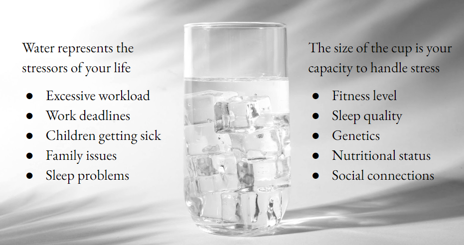 The cup itself is your ability to withstand stress. The size of your cup can increase or decrease. You can increase the size of your cup by making sure you sleep enough, you exercise, you get enough energy from your balanced diet, you have social connections, and so on.